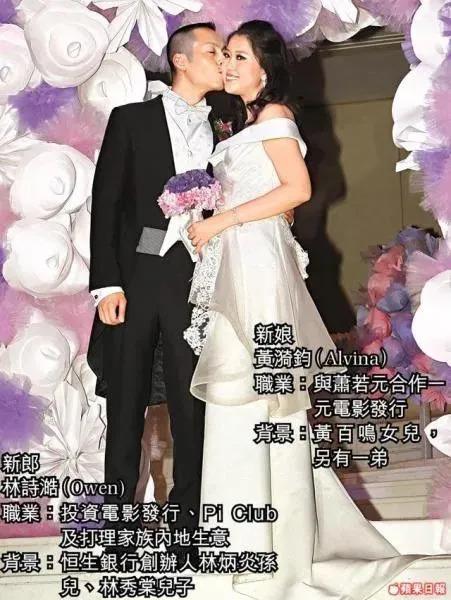 ▲ 2010年,林秀棠小儿子林诗澔迎娶香港影坛大佬黄百鸣(关于他的贺岁片,我们才刚写过,这里可回顾)的女儿黄漪钧,在香港传统的老钱酒店丽晶酒店筵开50席,不仅婚礼场面盛大,而且来宾也是个个大有来头,包括香港寰亚传媒老板林建岳(林建岳家的故事这里可回顾)、英皇老板杨受成、以及古天乐、郑中基等香港娱乐圈名流。