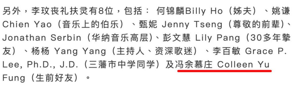 ▲ 李玟生前与冯余慕庄是好友,李玟去世(李玟的故事这里可回顾),冯余慕庄是指定的扶灵人之一。