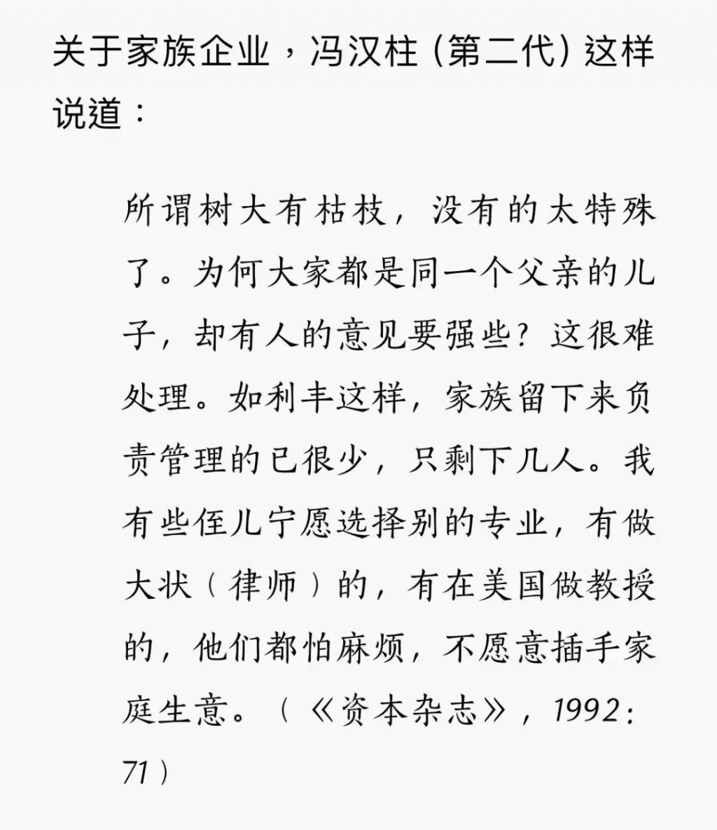 第一代冯柏燎当年有13个子女,传承到了第三代,只剩下冯国经和冯国纶兄弟,家族企业想要兴旺发达,家族长老必然要选择后代中最能干的,也就是说,后代之间必然就存在竞争,存在优胜劣汰。