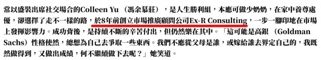 ▲ 冯余慕庄毕业于美国名校康奈尔大学,毕业后曾入职毕马威、高盛,是货真价实的金融精英。2009年嫁于冯国纶独子冯裕铭,婚后余慕庄开始经营自己的市场推广顾问公司,并非不事生产的豪门阔太。