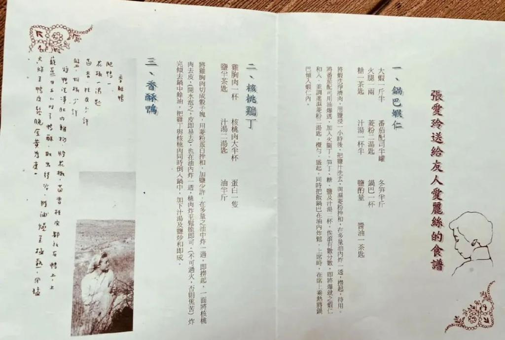 他用心找到浸会大学多年前的一张晚宴菜单,题为"张爱玲送给友人爱丽丝的食谱",有三道菜的名称、食材与做法:锅巴虾仁,核桃鸡丁,香酥鸭。