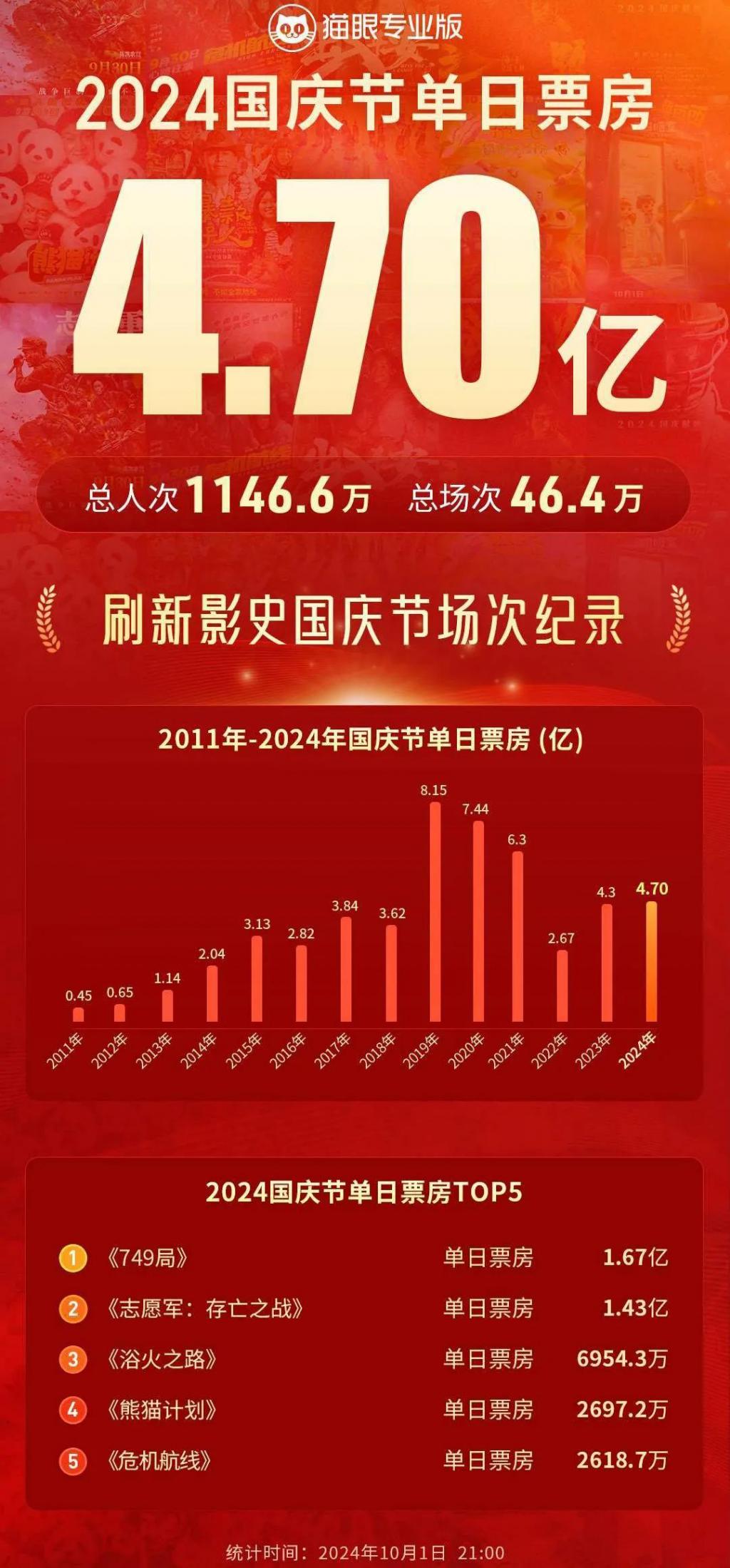 国庆节单日票房4.7亿,超过了2025年同期的一半水平。