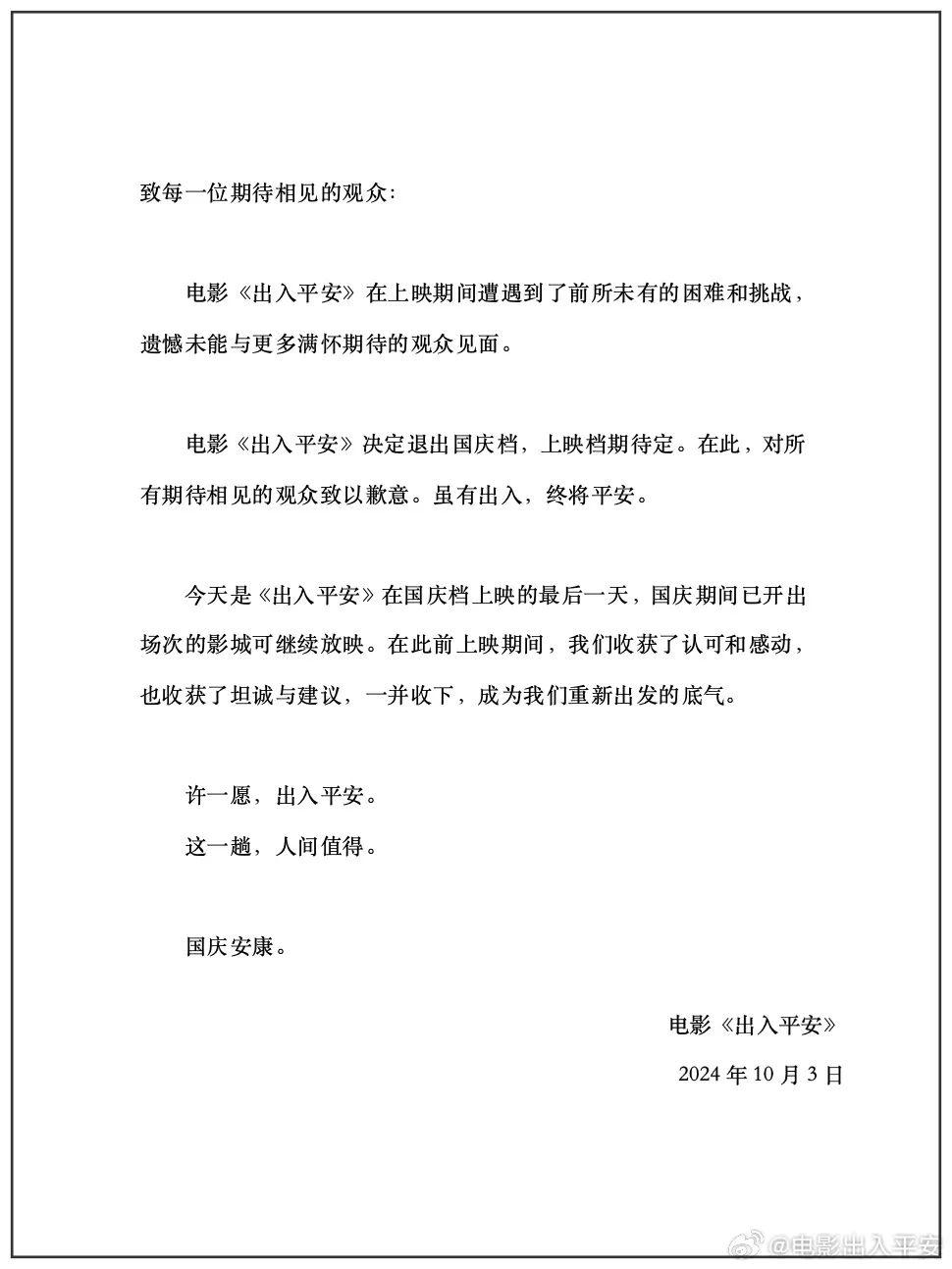 已经有国庆档片子看不到了,——《出入平安》已撤档。