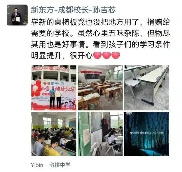 新东方成都学校校长孙吉芯率先联系公益基金会,将课桌椅捐向 4 所乡村学校,俞敏洪得知后,呼吁各分校捐出桌椅
