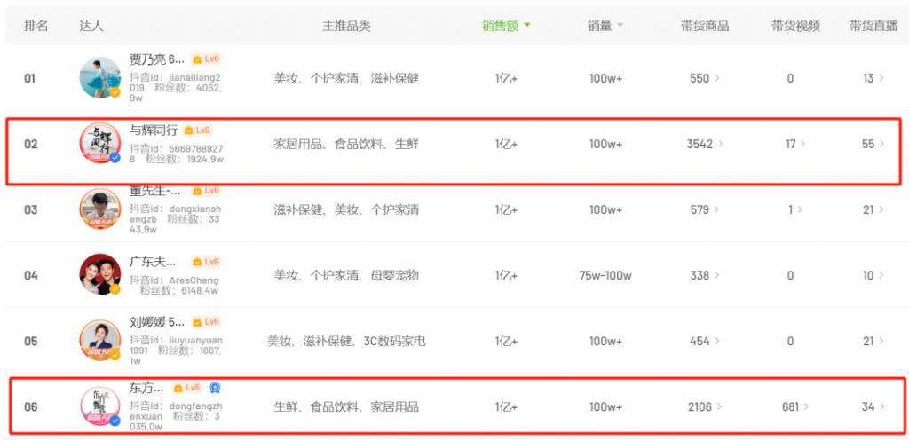飞瓜数据显示,在 5 月抖音带货达人榜中,与辉同行已经超越东方甄选