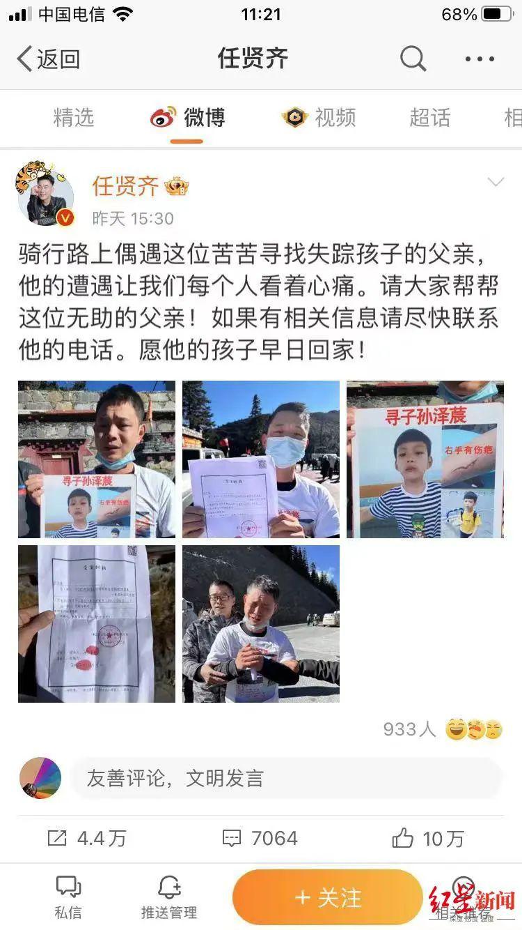 11 月 17 日,孙先生向路过雅江的任贤齐等艺人求助,任贤齐随后在微博上转发了孙先生的寻子求助信息,并发声帮他寻找失踪的儿子," 骑行路上偶遇这位苦苦寻找失踪孩子的父亲,他的遭遇让我们每个人看着心痛。请大家帮帮这位无助的父亲!愿他的孩子早日回家!"
