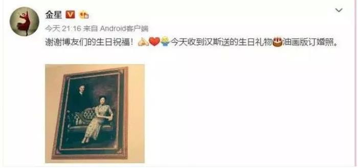 8月初,金星就发文宣布休假,据媒体爆料,此次金星特意休假其实是准备为与老公汉斯的婚礼,两人将在8月下旬复婚,婚礼场地选在美丽的意大利。金星也透露,这幅既有复古年代感又不落俗套的油画订婚照,正是老公汉斯送的礼物。