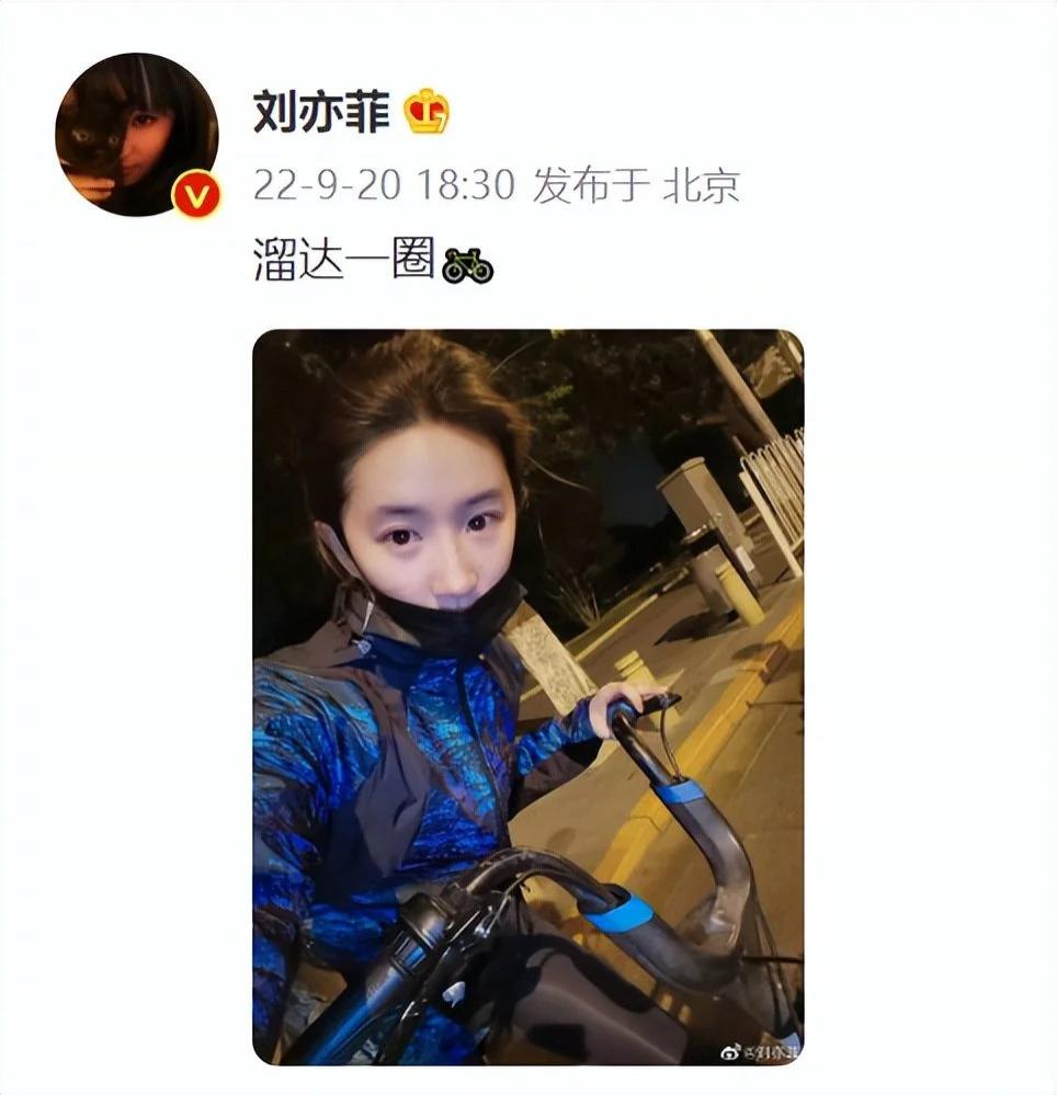 9 月 20 日,著名演员刘亦菲在社交平台晒出自己骑自行车的素颜照片,并配文 " 溜达一圈 ",引发网友热议。