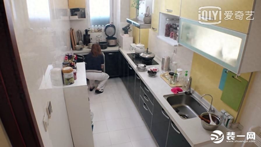魏大勋家的厨房跟许多家庭一样,布满了柴米油盐,但还是可以看出整体的设计。L型黑色橱柜设计搭配白色大理石台面,简约大气,橱柜上方安装了很多黄色吊柜用来存储物品,收纳可以说很足了。