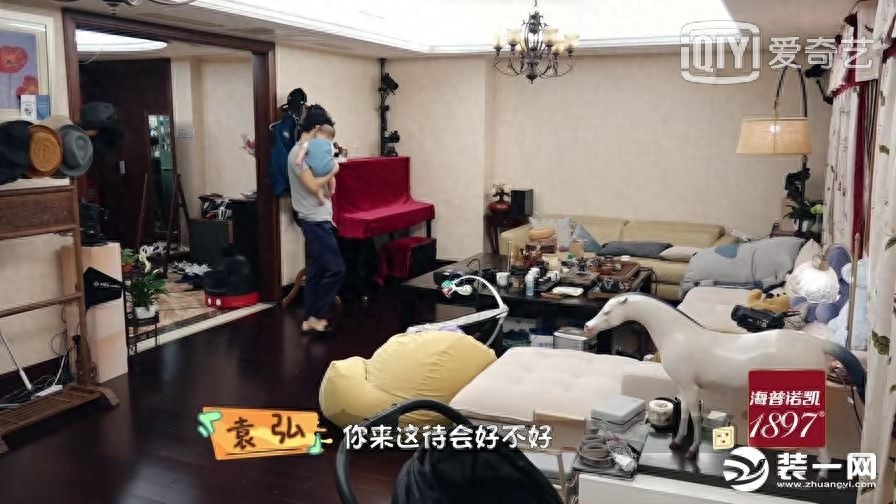 袁弘家通过客厅可以看出他家整个装修是比较偏美式的。因为有孩子的原因,整个客厅看起来有些乱,但通过天花板的美式吊灯,沙发旁边的落地灯和门口的衣帽架可以了解到袁弘张歆艺夫妇精致的生活态度。