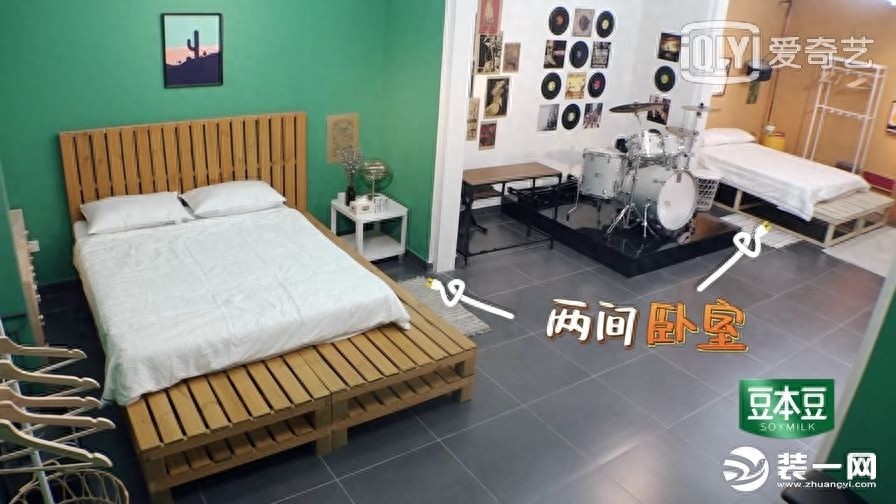 卧室设计就很有意思了,看似两间卧室,实则用一个音乐区隔开做出两个开放是空间,给人隔而不断的效果。两人的卧室布置基本上都一样,竹木板的大床显得简约舒适。两间卧室分别用绿色和橘色墙面做装饰,代表了各自不同的性格。