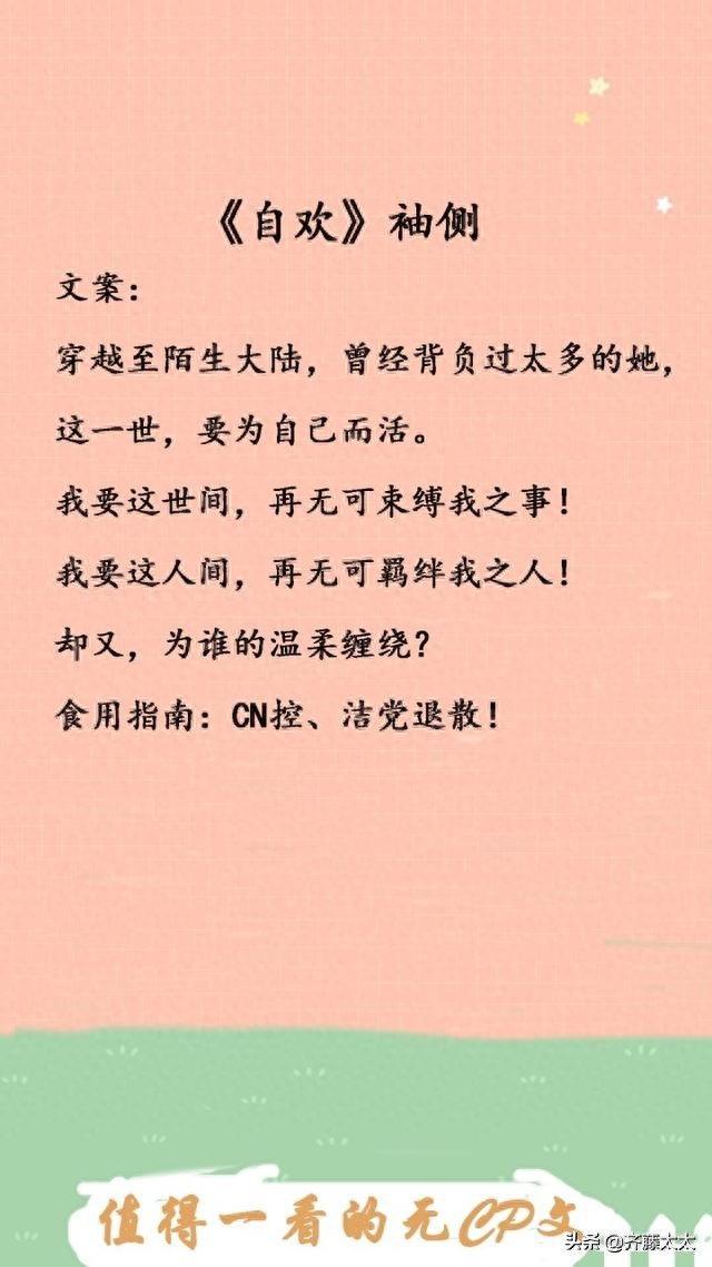 袖侧一直是我认为写文比较有深度的作者,《人海中的你》《如果你是菟丝花》《女王的小鲜肉》《攻略不下来的男人》都很经典,每一本都反映了女性的困境与自强,这一本《自欢》同样如此。此作者风格酸甜口,有虐女主情节,毕竟现实向,不经风雨女主不能强大起来,另外洁癖党慎入,除了《人海中的你》是双C,其他的洁党慎入。