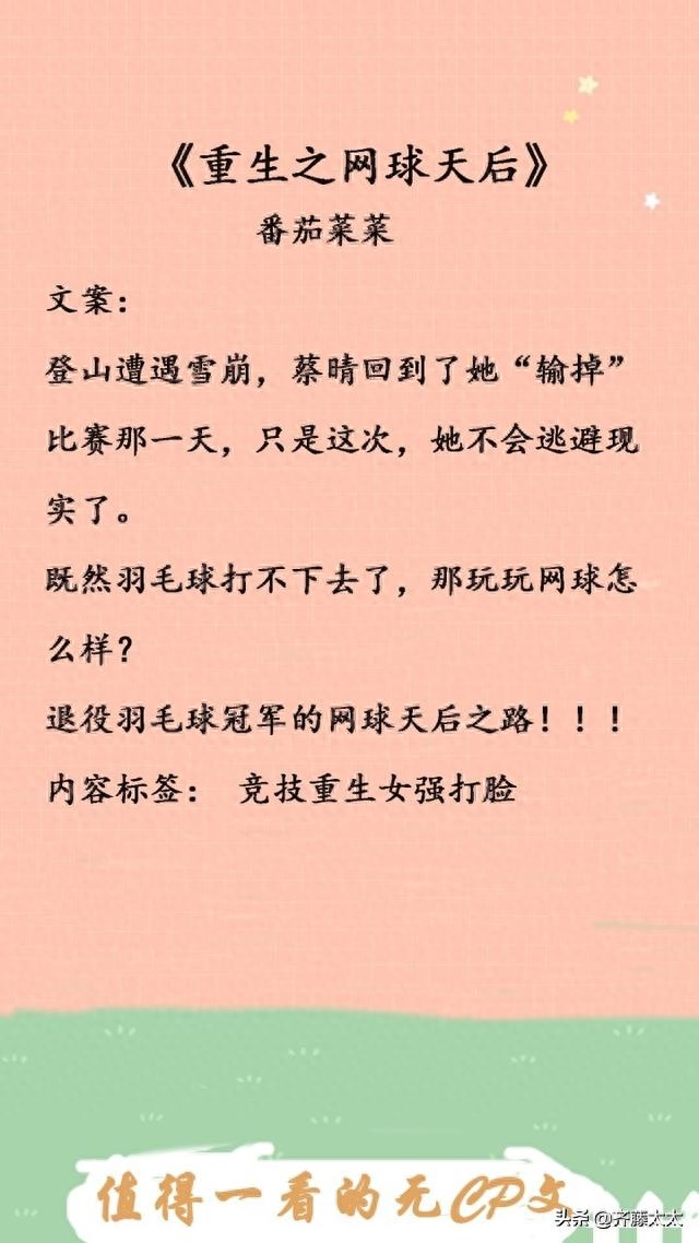 《重生之网球天后》是我去年还是前年看过的文,那时候没怎么接触无CP文,一开始以为有男主,没想到看到最后也没有哈哈哈,但是剧情很好看,特别正能量,女主在网球上的奋斗之路看得我热血沸腾,有女主光环,爽文,推荐!
