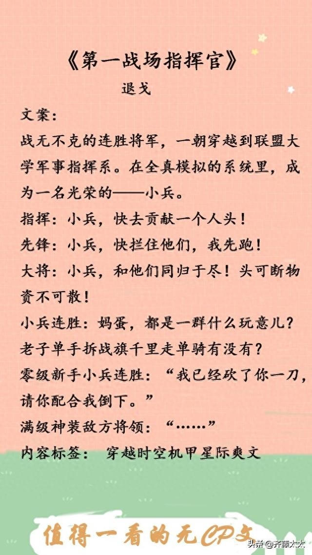 《第一战场指挥官》是腿哥的成名作,星际文,女强爽文,我一直码在书架的文,口碑很好,可以一看!