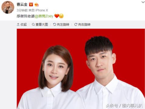 据悉,曹云金妻子唐菀是曾出演《人民的名义》中林华华一角而被大众熟知。曹云金与唐菀的恋情被曝光后,曹云金也在去年8月承认恋情,并表示两人“是奔着结婚去的”。