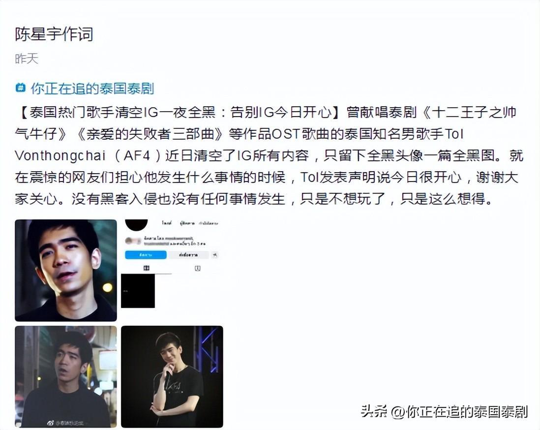 【泰国热门歌手清空IG一夜全黑:告别IG今日开心】曾献唱泰剧《十二王子之帅气牛仔》《亲爱的失败者三部曲》等作品OST歌曲的泰国知名男歌手Tol Vonthongchai (AF4)近日清空了IG所有内容,只留下全黑头像一篇全黑图。就在震惊的网友们担心他发生什么事情的时候,Tol发表声明说今日很开心,谢谢大家关心。没有黑客入侵也没有任何事情发生,只是不想玩了,只是这么想得。