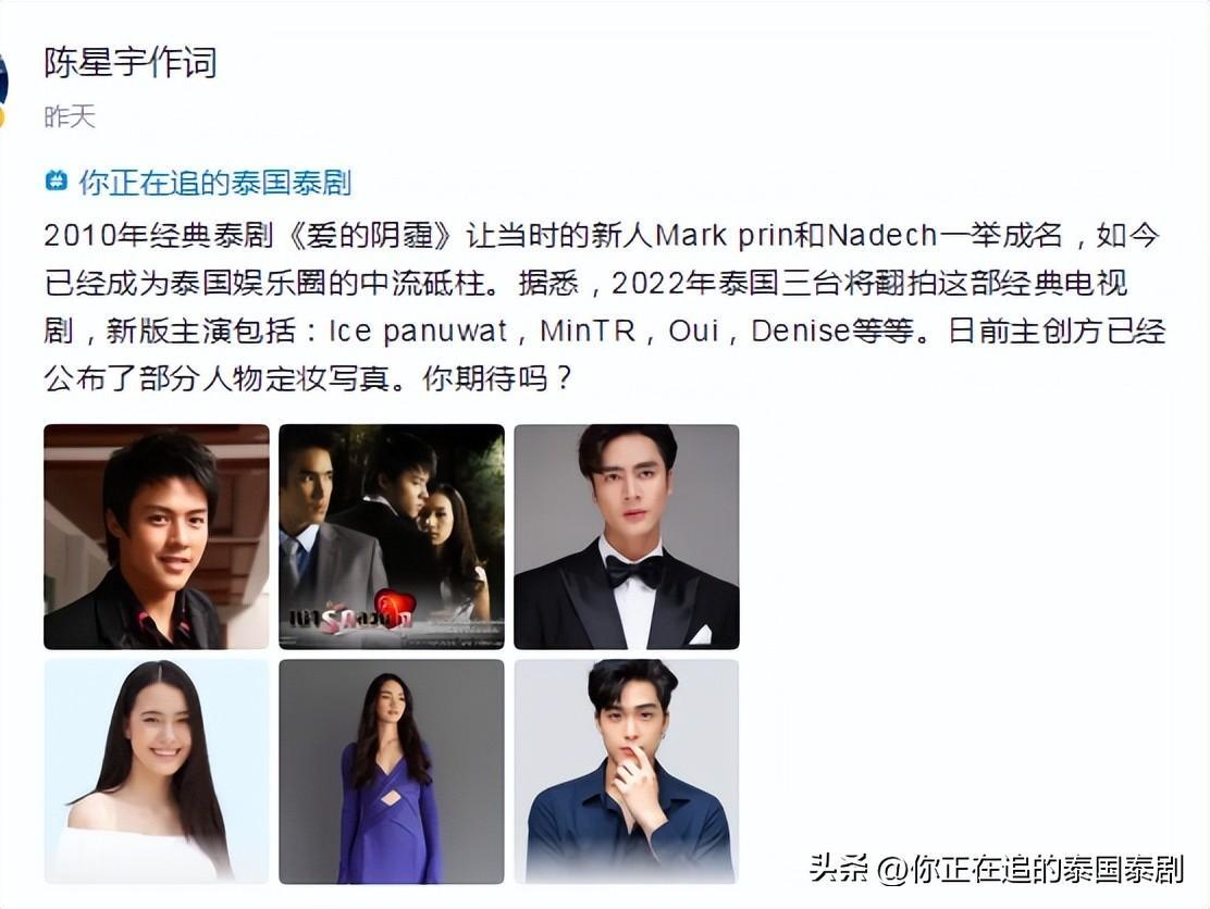 2010年经典泰剧《爱的阴霾》让当时的新人Mark prin和Nadech一举成名,如今已经成为泰国娱乐圈的中流砥柱。据悉,2022年泰国三台将翻拍这部经典电视剧,新版主演包括:Ice panuwat,MinTR,Oui,Denise等等。日前主创方已经公布了部分人物定妆写真。你期待吗?
