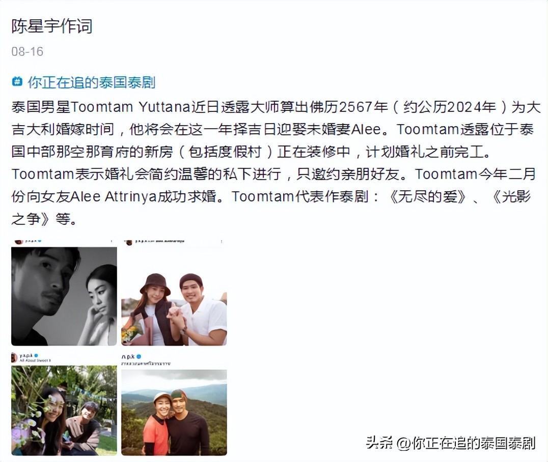 泰国男星Toomtam Yuttana近日透露大师算出佛历2567年(约公历2024年)为大吉大利婚嫁时间,他将会在这一年择吉日迎娶未婚妻Alee。Toomtam透露位于泰国中部那空那育府的新房(包括度假村)正在装修中,计划婚礼之前完工。Toomtam表示婚礼会简约温馨的私下进行,只邀约亲朋好友。Toomtam今年二月份向女友Alee Attrinya成功求婚。Toomtam代表作泰剧:《无尽的爱》、《光影之争》等。