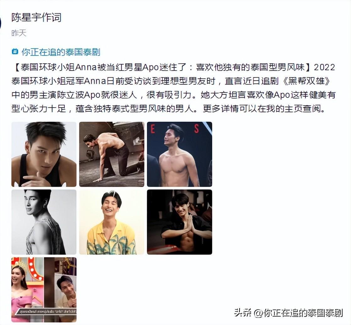 【泰国环球小姐Anna被当红男星Apo迷住了:喜欢他独有的泰国型男风味】2022泰国环球小姐冠军Anna日前受访谈到理想型男友时,直言近日追剧《黑帮双雄》中的男主演陈立波Apo就很迷人,很有吸引力。她大方坦言喜欢像Apo这样健美有型心张力十足,蕴含独特泰式型男风味的男人。更多详情可以在我的主页查阅。