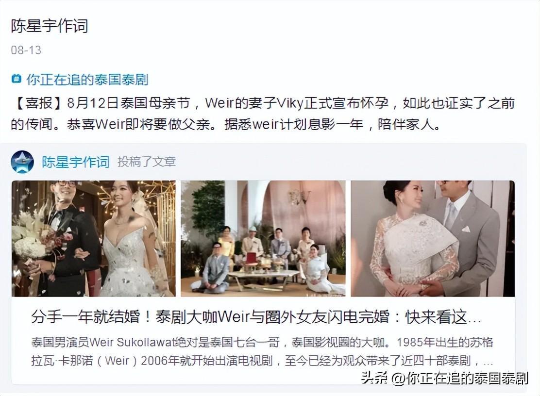 【喜报】8月12日泰国母亲节,Weir的妻子Viky正式宣布怀孕,如此也证实了之前的传闻。恭喜Weir即将要做父亲。据悉weir计划息影一年,陪伴家人。