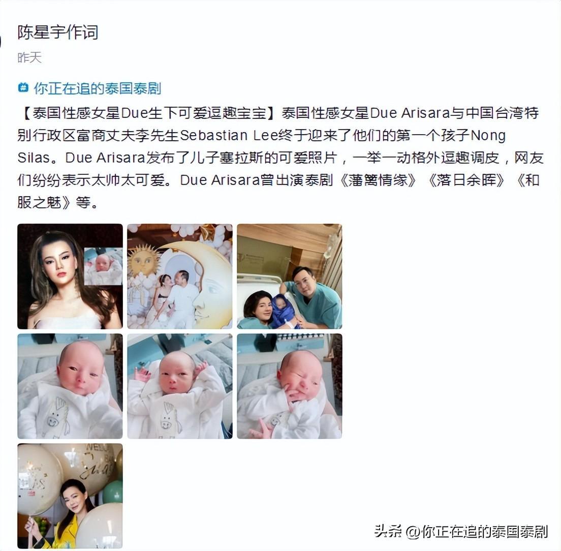 【泰国性感女星Due生下可爱逗趣宝宝】泰国性感女星Due Arisara与中国台湾特别行政区富商丈夫李先生Sebastian Lee终于迎来了他们的第一个孩子Nong Silas。Due Arisara发布了儿子塞拉斯的可爱照片,一举一动格外逗趣调皮,网友们纷纷表示太帅太可爱。Due Arisara曾出演泰剧《藩篱情缘》《落日余晖》《和服之魅》等。