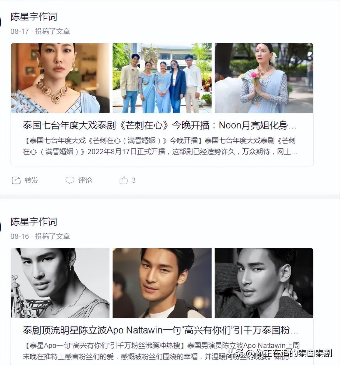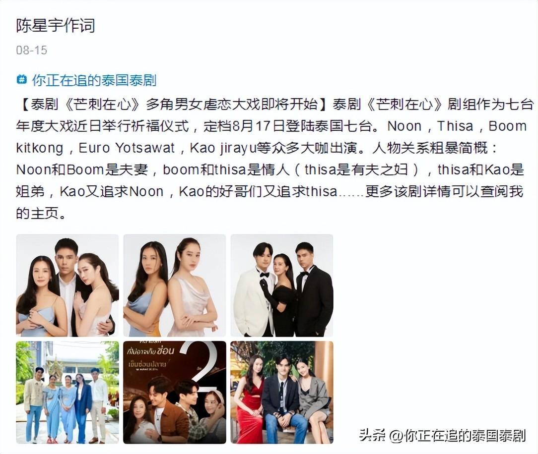 【泰剧《芒刺在心》多角男女虐恋大戏即将开始】泰剧《芒刺在心》剧组作为七台年度大戏近日举行祈福仪式,定档8月17日登陆泰国七台。Noon,Thisa,Boom kitkong,Euro Yotsawat,Kao jirayu等众多大咖出演。人物关系粗暴简概:Noon和Boom是夫妻,boom和thisa是情人(thisa是有夫之妇),thisa和Kao是姐弟,Kao又追求Noon,Kao的好哥们又追求thisa......更多该剧详情可以查阅我的主页。