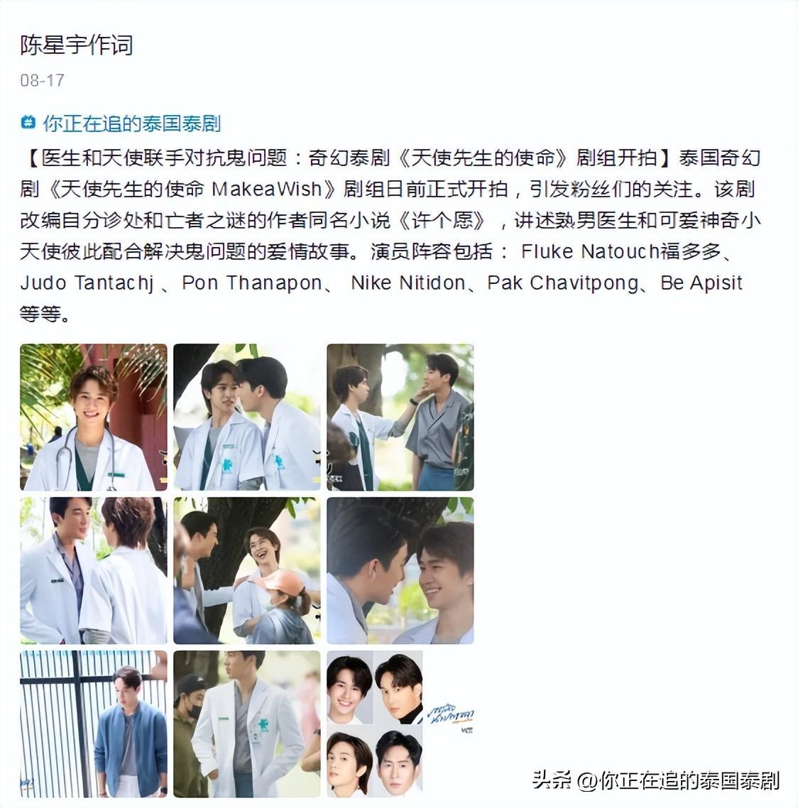 【医生和天使联手对抗鬼问题:奇幻泰剧《天使先生的使命》剧组开拍】泰国奇幻剧《天使先生的使命 MakeaWish》剧组日前正式开拍,引发粉丝们的关注。该剧改编自分诊处和亡者之谜的作者同名小说《许个愿》,讲述熟男医生和可爱神奇小天使彼此配合解决鬼问题的爱情故事。演员阵容包括: Fluke Natouch福多多、Judo Tantachj 、Pon Thanapon、 Nike Nitidon、Pak Chavitpong、Be Apisit等等。