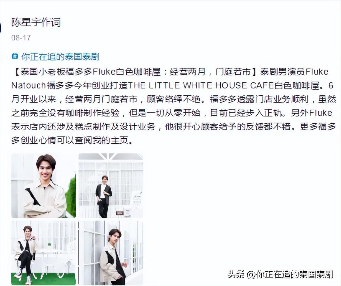 【泰国小老板福多多Fluke白色咖啡屋:经营两月,门庭若市】泰剧男演员Fluke Natouch福多多今年创业打造THE LITTLE WHITE HOUSE CAFE白色咖啡屋。6月开业以来,经营两月门庭若市,顾客络绎不绝。福多多透露门店业务顺利,虽然之前完全没有咖啡制作经验,但是一切从零开始,目前已经步入正轨。另外Fluke表示店内还涉及糕点制作及设计业务,他很开心顾客给予的反馈都不错。更多福多多创业心情可以查阅我的主页。