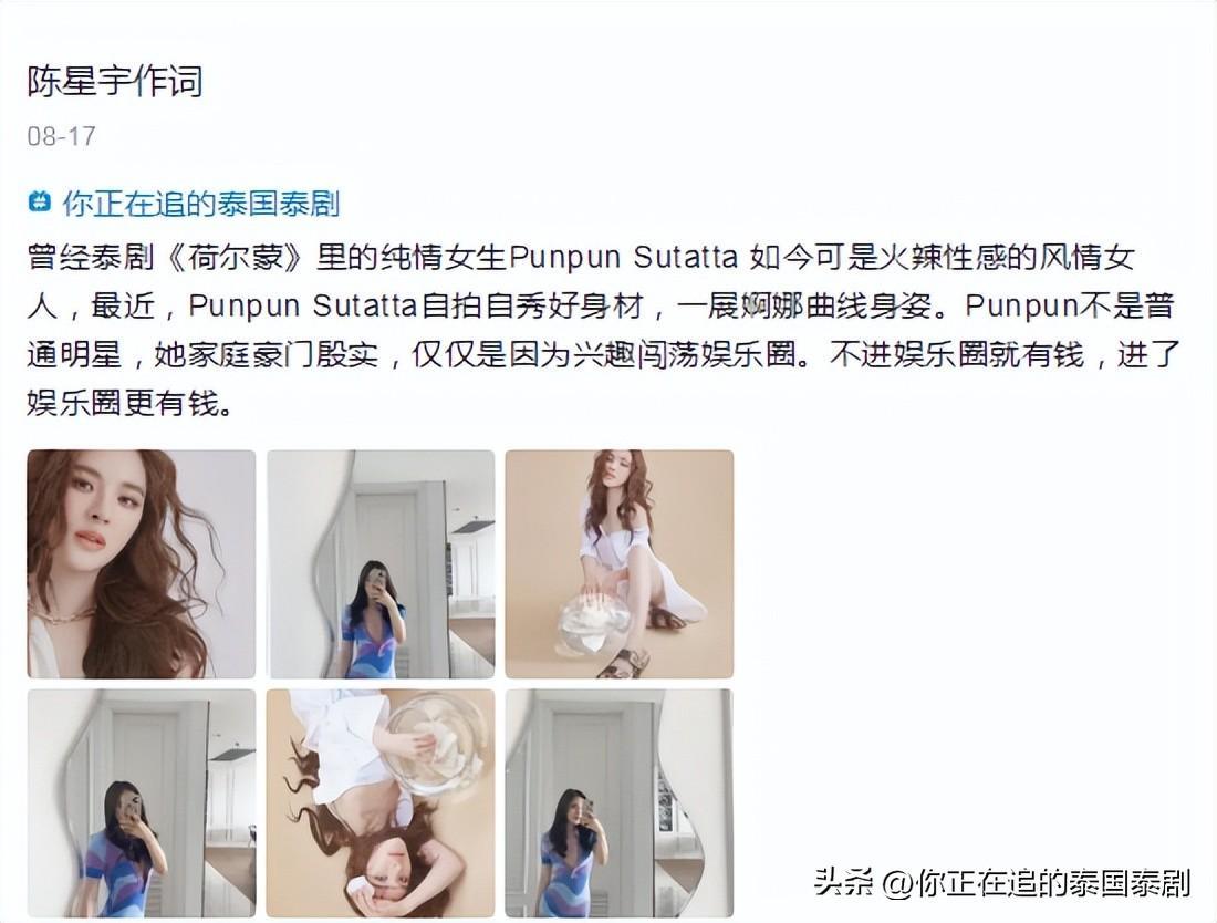 曾经泰剧《荷尔蒙》里的纯情女生Punpun Sutatta 如今可是火辣性感的风情女人,最近,Punpun Sutatta自拍自秀好身材,一展婀娜曲线身姿。Punpun不是普通明星,她家庭豪门殷实,仅仅是因为兴趣闯荡娱乐圈。不进娱乐圈就有钱,进了娱乐圈更有钱。