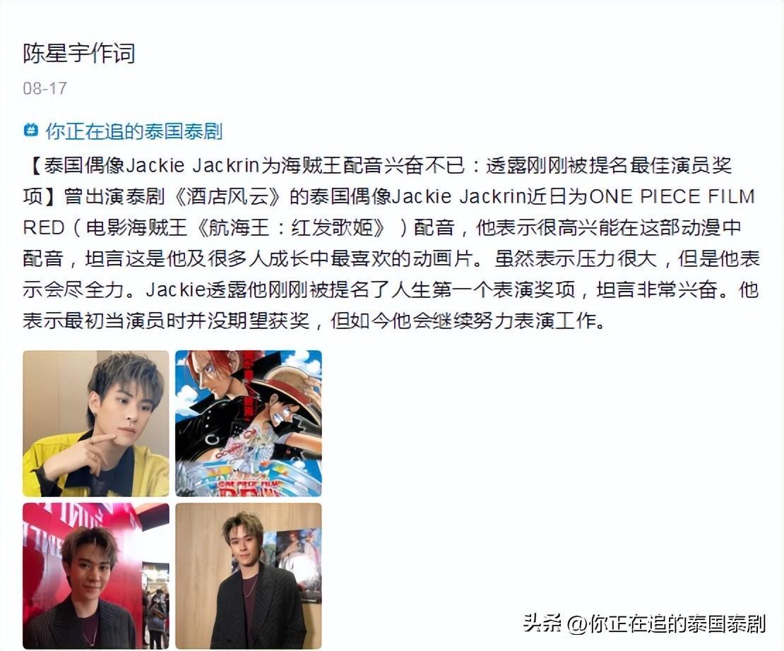 【泰国偶像Jackie Jackrin为海贼王配音兴奋不已:透露刚刚被提名最佳演员奖项】曾出演泰剧《酒店风云》的泰国偶像Jackie Jackrin近日为ONE PIECE FILM RED(电影海贼王《航海王:红发歌姬》)配音,他表示很高兴能在这部动漫中配音,坦言这是他及很多人成长中最喜欢的动画片。虽然表示压力很大,但是他表示会尽全力。Jackie透露他刚刚被提名了人生第一个表演奖项,坦言非常兴奋。他表示最初当演员时并没期望获奖,但如今他会继续努力表演工作。