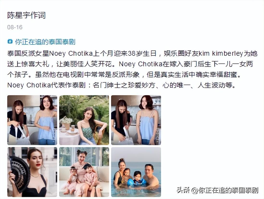 泰国反派女星Noey Chotika上个月迎来38岁生日,娱乐圈好友kim kimberley为她送上惊喜大礼,让美丽佳人笑开花。Noey Chotika在嫁入豪门后生下一儿一女两个孩子。虽然他在电视剧中常常是反派形象,但是真实生活中确实幸福甜蜜。Noey Chotika代表作泰剧:名门绅士之珍爱妙方、心的唯一、人生波动等。