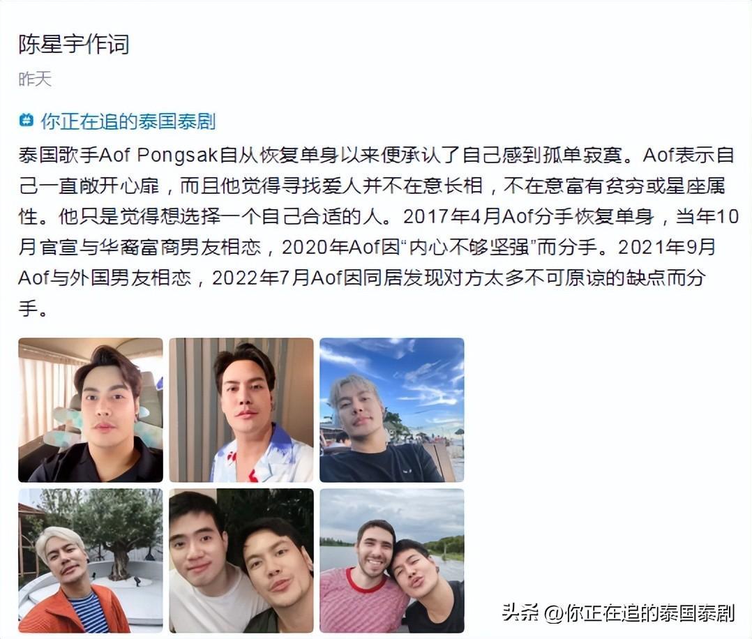 泰国歌手Aof Pongsak自从恢复单身以来便承认了自己感到孤单寂寞。Aof表示自己一直敞开心扉,而且他觉得寻找爱人并不在意长相,不在意富有贫穷或星座属性。他只是觉得想选择一个自己合适的人。2017年4月Aof分手恢复单身,当年10月官宣与华裔富商男友相恋,2020年Aof因“内心不够坚强”而分手。2021年9月Aof与外国男友相恋,2022年7月Aof因同居发现对方太多不可原谅的缺点而分手。