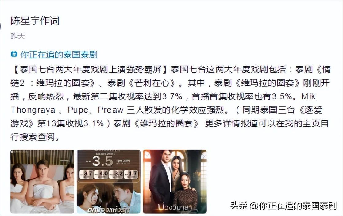 【泰国七台两大年度戏剧上演强势霸屏】泰国七台这两大年度戏剧包括:泰剧《情链2 :维玛拉的圈套》、泰剧《芒刺在心》。其中,泰剧《维玛拉的圈套》刚刚开播,反响热烈,最新第二集收视率达到3.7%,首播首集收视率也有3.5%。Mik Thongraya 、Pupe、Preaw 三人散发的化学效应强烈。(同期泰国三台《逐爱游戏》第13集收视3.1%)泰剧《维玛拉的圈套》 更多详情报道可以在我的主页自行搜索查阅。