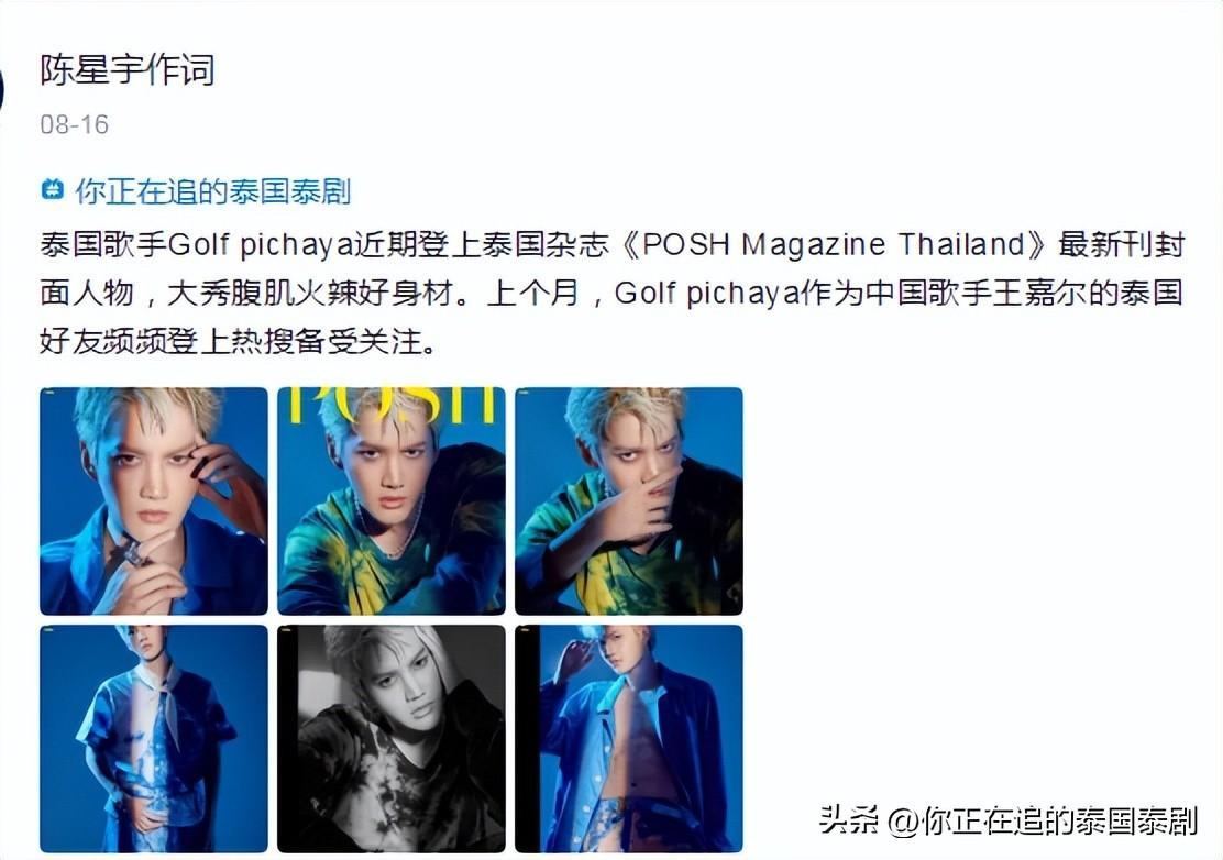 泰国歌手Golf pichaya近期登上泰国杂志《POSH Magazine Thailand》最新刊封面人物,大秀腹肌火辣好身材。上个月,Golf pichaya作为中国歌手王嘉尔的泰国好友频频登上热搜备受关注。