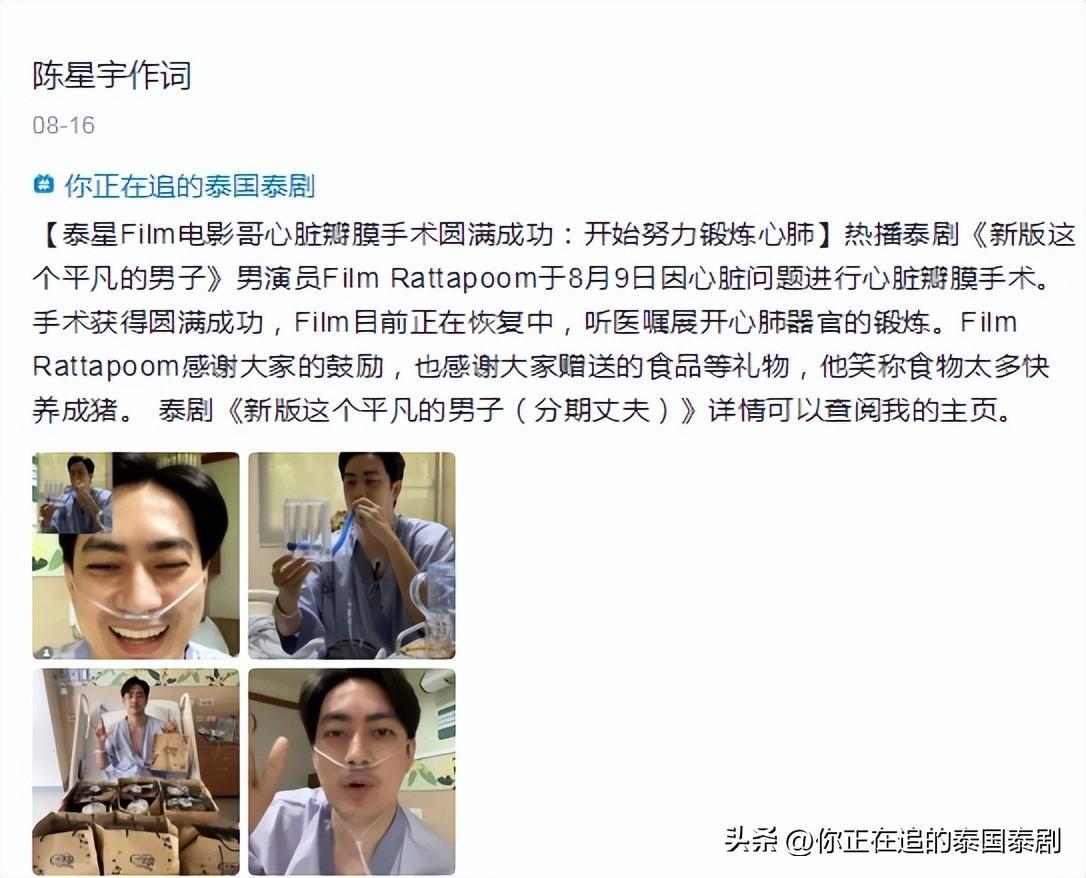 【泰星Film电影哥心脏瓣膜手术圆满成功:开始努力锻炼心肺】热播泰剧《新版这个平凡的男子》男演员Film Rattapoom于8月9日因心脏问题进行心脏瓣膜手术。手术获得圆满成功,Film目前正在恢复中,听医嘱展开心肺器官的锻炼。Film Rattapoom感谢大家的鼓励,也感谢大家赠送的食品等礼物,他笑称食物太多快养成猪。 泰剧《新版这个平凡的男子(分期丈夫)》详情可以查阅我的主页。