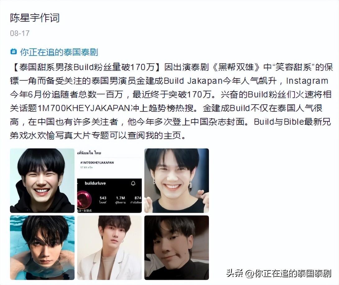 【泰国甜系男孩Build粉丝量破170万】因出演泰剧《黑帮双雄》中“笑容甜系”的保镖一角而备受关注的泰国男演员金建成Build Jakapan今年人气飙升,Instagram今年6月份追随者总数一百万,最近终于突破170万。兴奋的Build粉丝们火速将相关话题1M700KHEYJAKAPAN冲上趋势榜热搜。金建成Build不仅在泰国人气很高,在中国也有许多关注者,他今年多次登上中国杂志封面。Build与Bible最新兄弟戏水欢愉写真大片专题可以查阅我的主页。