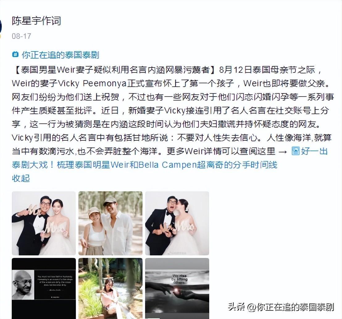 【泰国男星Weir妻子疑似利用名言内涵网暴污蔑者】8月12日泰国母亲节之际,Weir的妻子Vicky Peemonya正式宣布怀上了第一个孩子,Weir也即将要做父亲。网友们纷纷为他们送上祝贺,不过也有一些网友对于他们闪恋闪婚闪孕等一系列事件产生质疑甚至批评。近日,新婚妻子Vicky接连引用了名人名言在社交账号上分享,这一行为被猜测是在内涵这段时间认为他们夫妇撒谎并持怀疑态度的网友。Vicky引用的名人名言中有包括甘地所说:不要对人性失去信心。人性像海洋,就算当中有数滴污水,也不会弄脏整个海洋。
