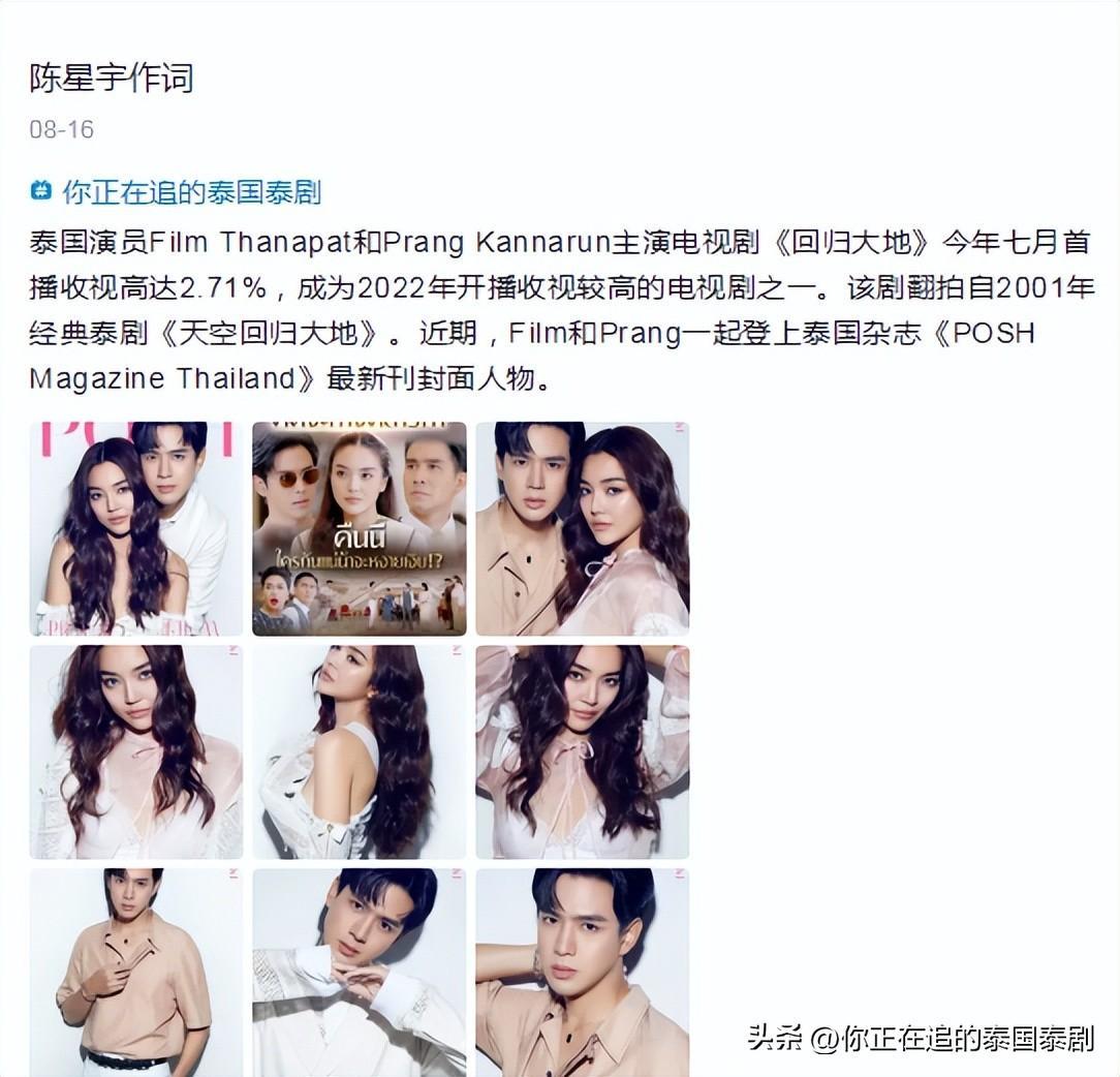 泰国演员Film Thanapat和Prang Kannarun主演电视剧《回归大地》今年七月首播收视高达2.71%,成为2022年开播收视较高的电视剧之一。该剧翻拍自2001年经典泰剧《天空回归大地》。近期,Film和Prang一起登上泰国杂志《POSH Magazine Thailand》最新刊封面人物。