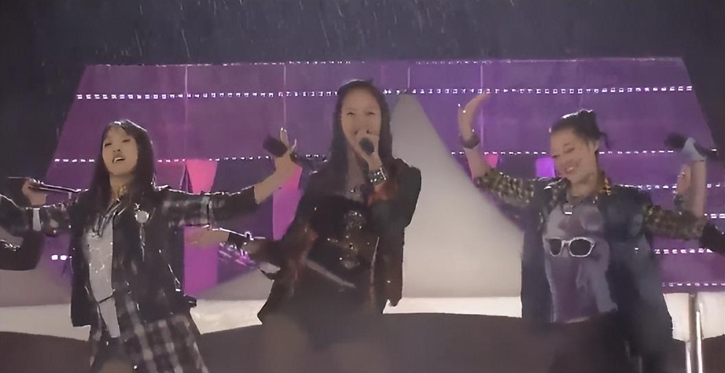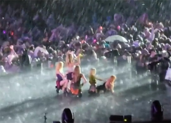 但一群女孩儿还是站上了舞台,穿着超短裙和高跟鞋在雨中唱跳,打滑都是小事,组合成员叶舒华直接重重摔倒在舞台上。