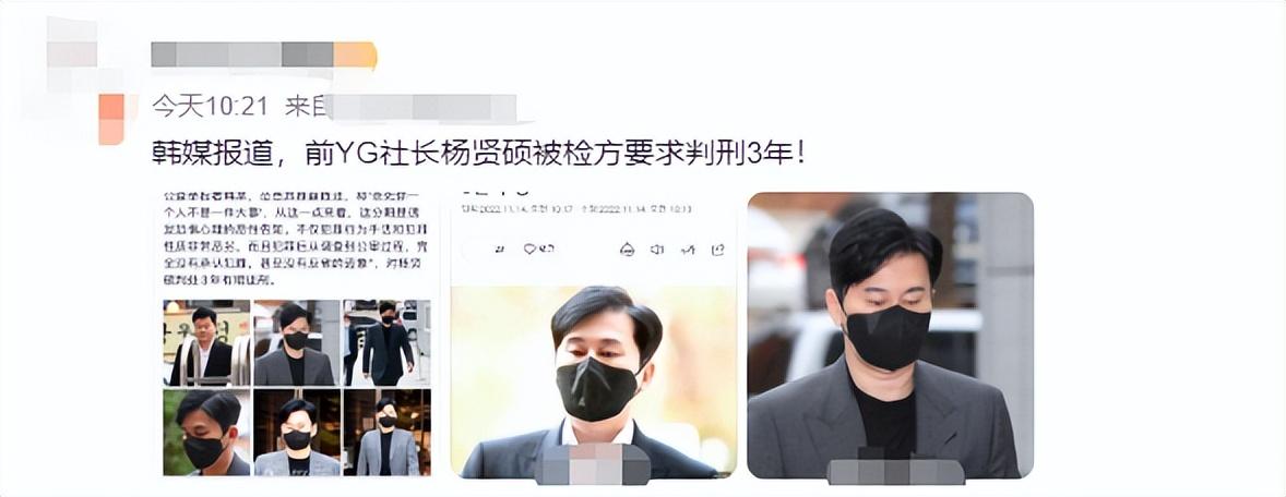 2025年11月14日,韩国娱乐圈三大社之一的YG娱乐公司前社长杨贤硕因涉嫌报复威胁违反了相关法律,被检方要求判处有期徒刑三年。