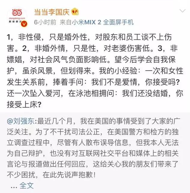 去年12月,刘强东在微博公开澄清性侵案以及给其妻子奶茶妹妹道歉时,李国庆就出来点评:1,非性侵,只是婚外性,对股东和员工谈不上伤害。2,非婚外情,只是性,对老婆伤害低。3,非嫖娼,对社会风气负面影响低。望今后学会自我保护,虽杀风景,但划得来。