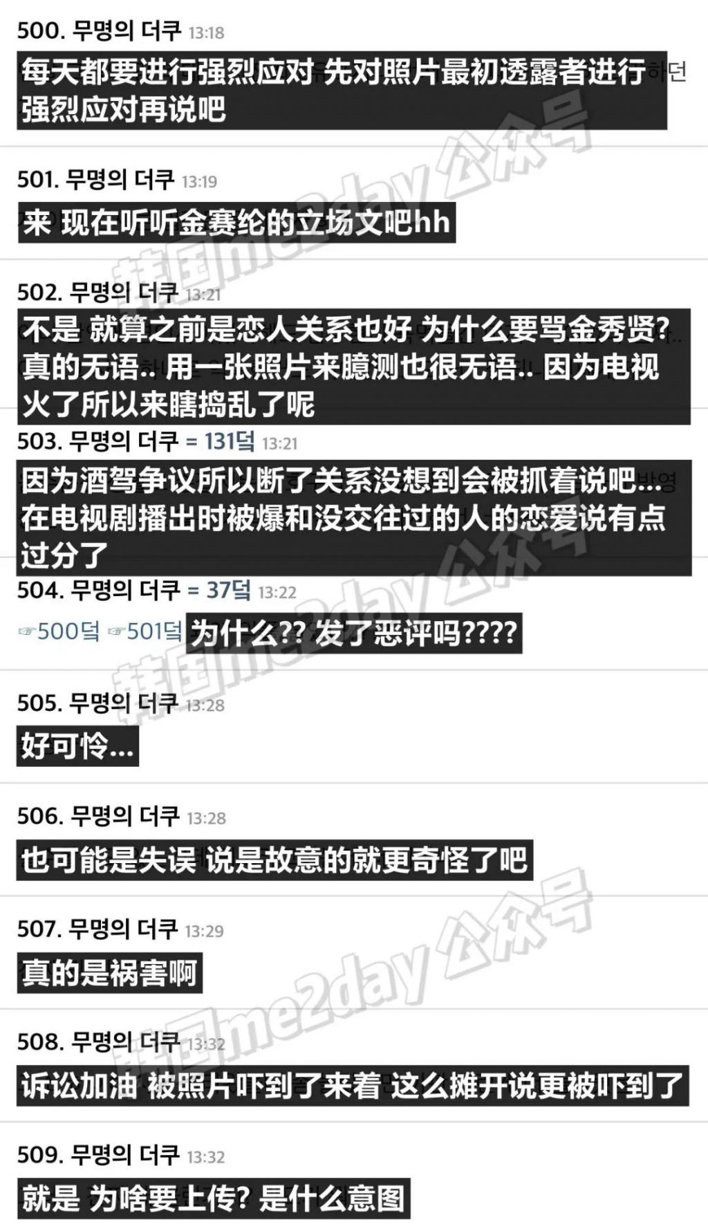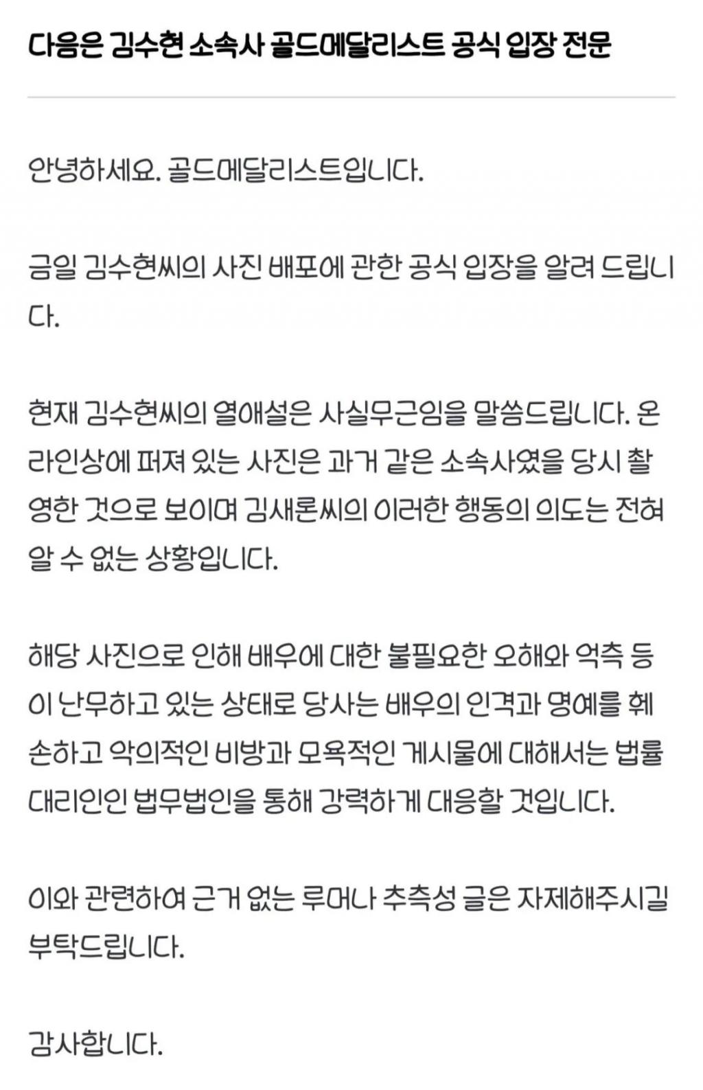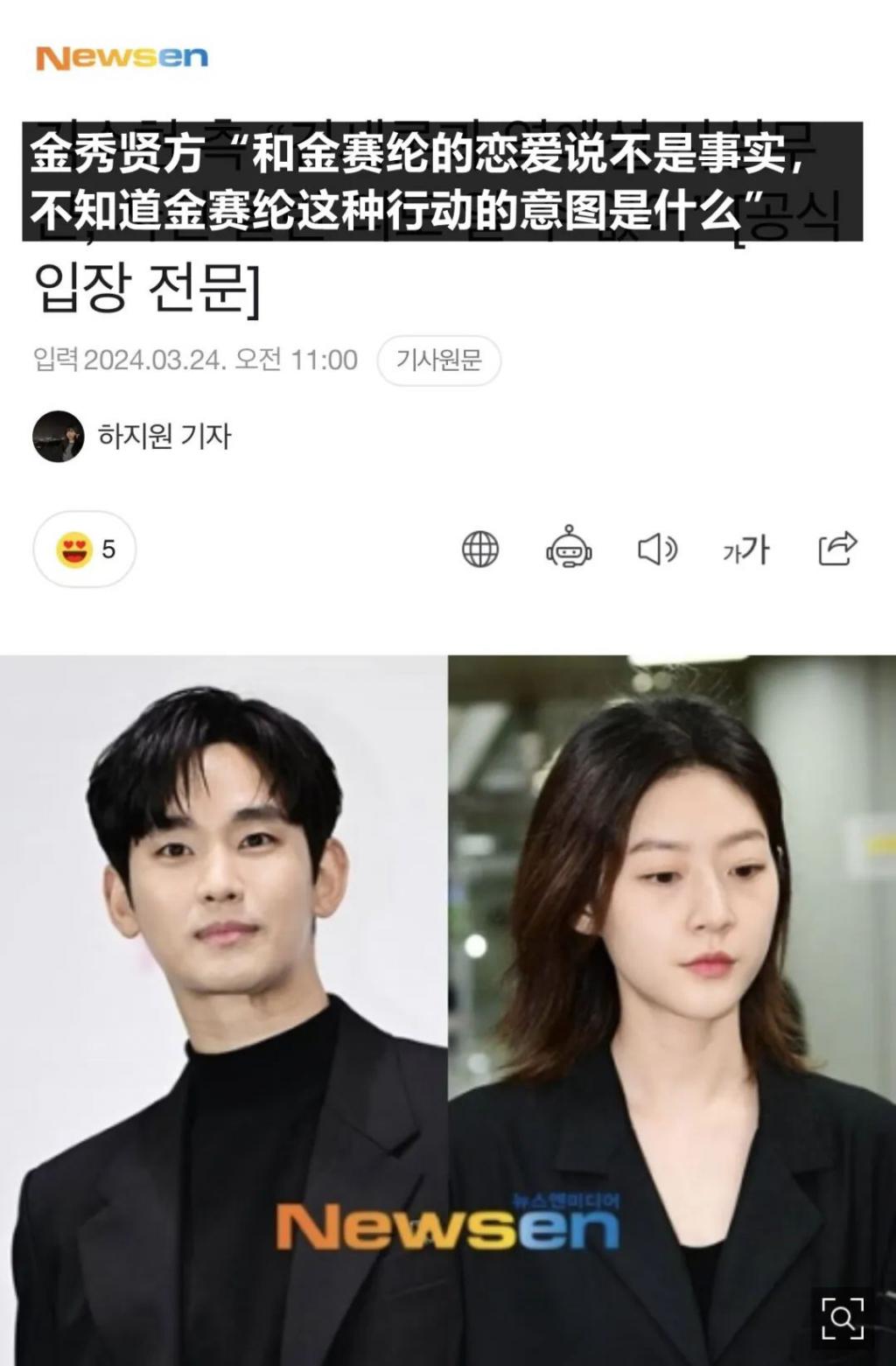 金秀贤所属经纪公司 24 日表示:" 恋爱说不是事实,网上流传的照片可能是过去同属一个经纪公司时拍摄的照片,完全不知道金赛纶这种行动的意图是什么 ",经济公司还表示 " 因为相关照片产生了对我社演员各种不必要的误会和臆测,我司将针对金秀贤损害名誉和人格的恶意诽谤采取强硬应对 "。
