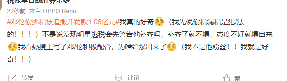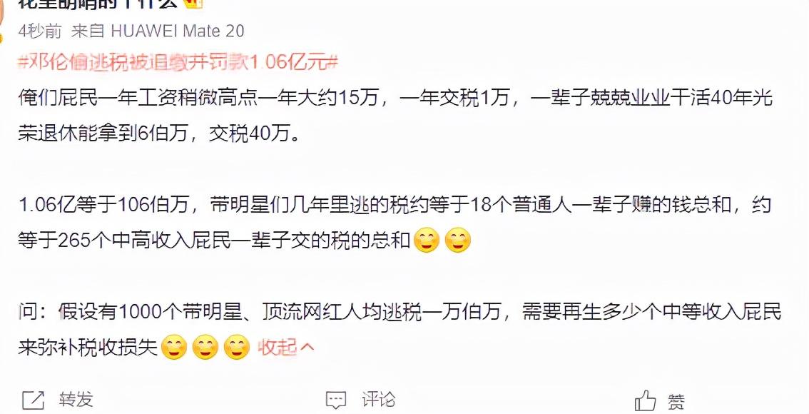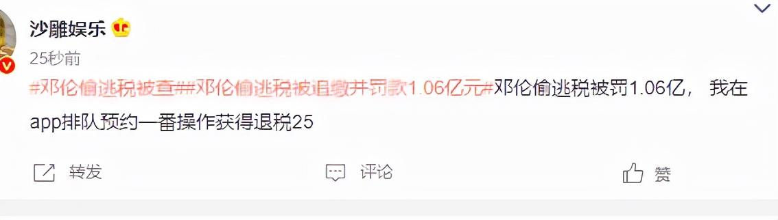 对于明星动辄上亿的罚款,网友表示,邓伦在逃税被罚1.06亿,我在APP排队预约操作退税。