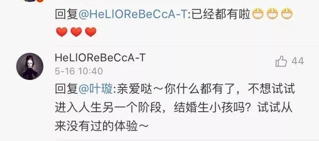 之前曾有网友微博留言问已经38岁的叶璇会不会考虑结婚生小孩,当时叶璇回答“已经都有了”,让不少人都猜测她已经秘密结婚并且怀孕,但叶璇没有正面回应。