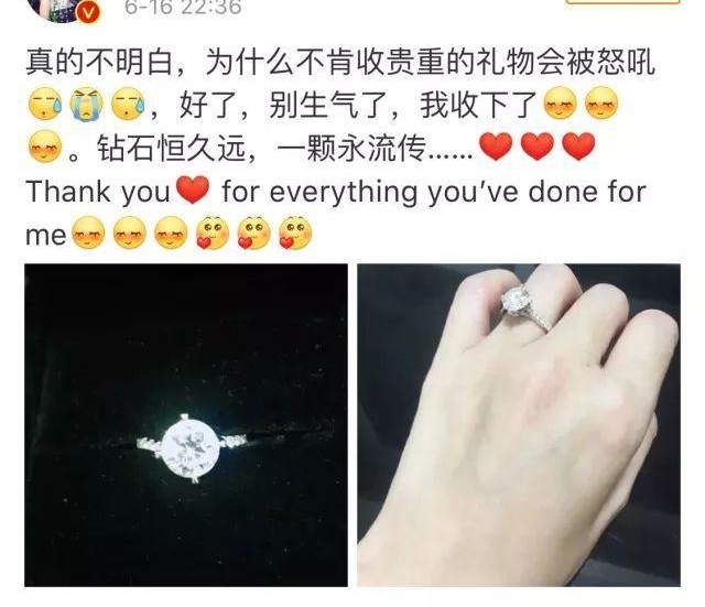 前天,她在微博上晒了一张无名指戴钻戒的照片。嗯,直观看上去,这钻戒很大了!而且配文:别生气了,我收下了。这感觉就像是霸道总裁在霸道求爱啊,男友力MAX。
