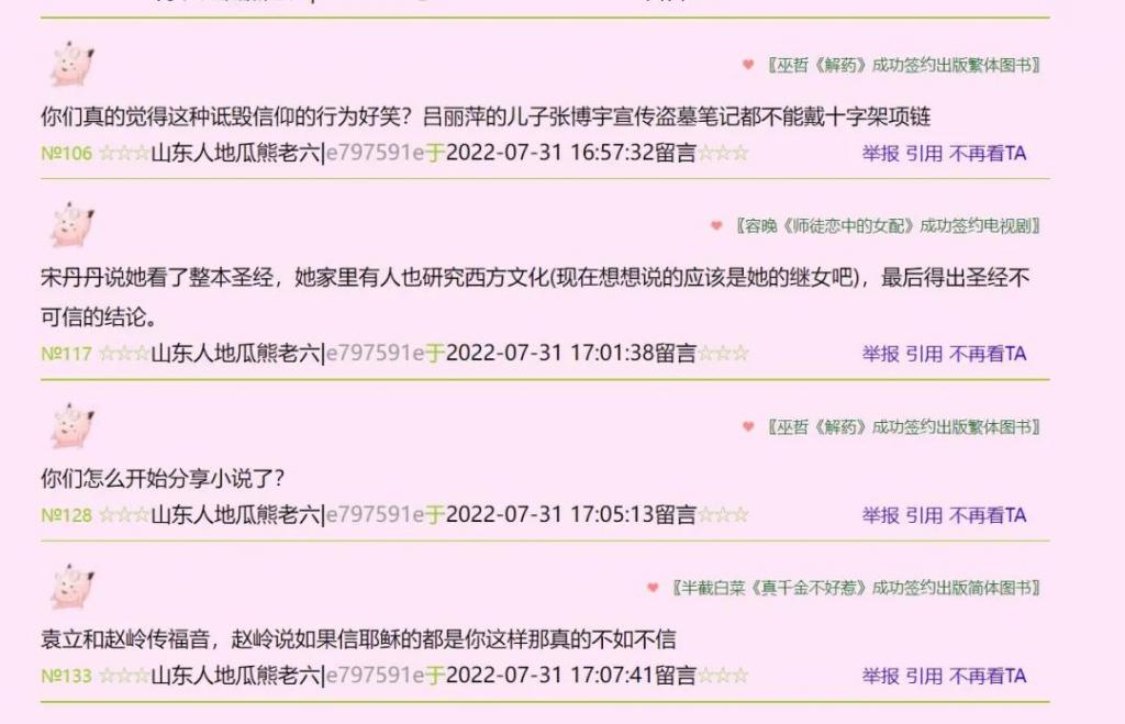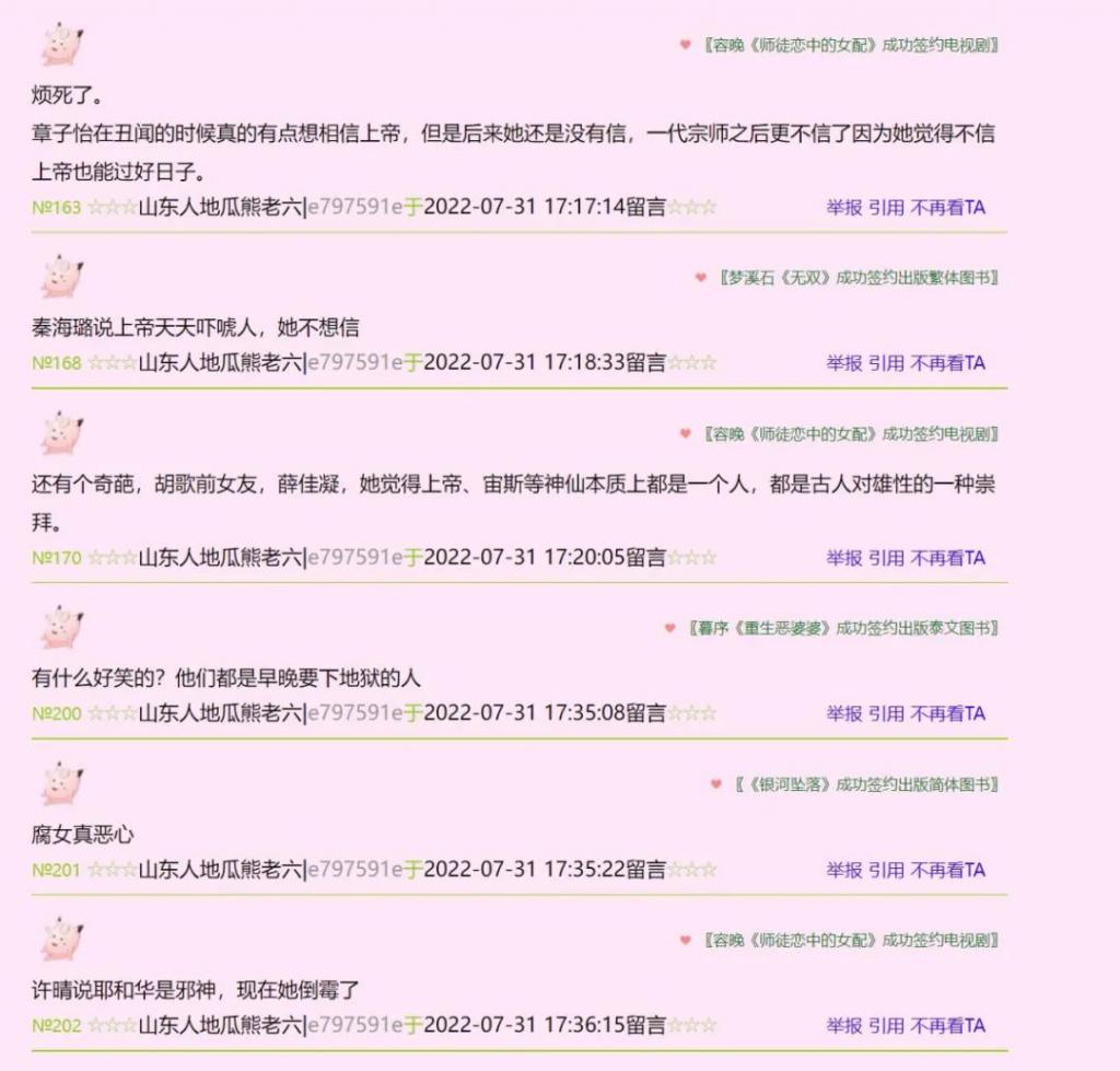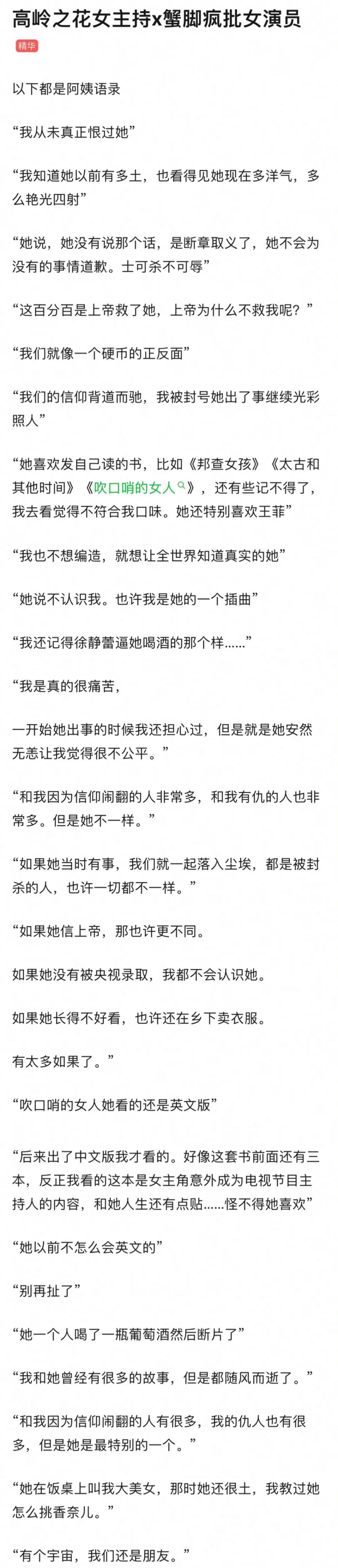 那样不怀好意的文字,依然能够透露出丝丝的温柔,她诋毁她们、咒骂她们、挖掘她们的黑历史,却无意当中给了她们最真实的褒奖。