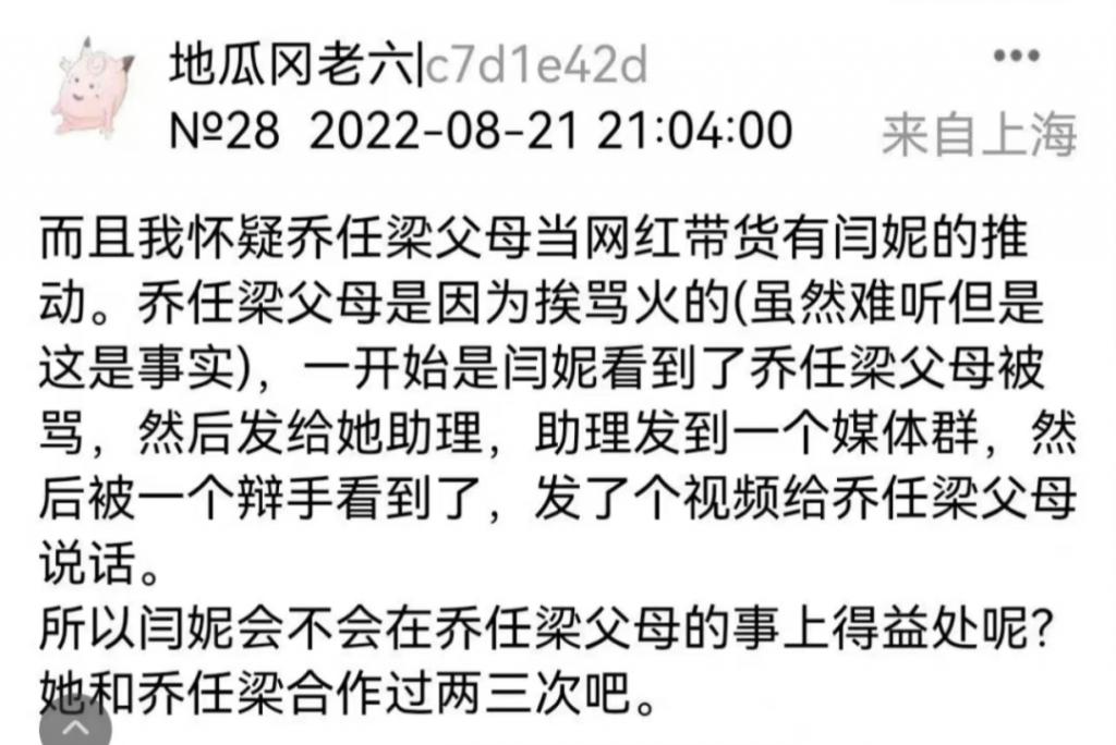 她还怀疑闫妮帮助去世的演员乔任梁的父母直播带货,是居心不良," 闫妮会不会在乔任梁父母的事上得益处呢?"