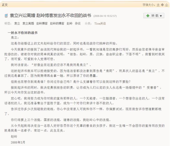 赵岭在微博上洋洋洒洒写了一篇《永不收回的战书》,字里行间背刺袁立是老佛爷,专横霸道,始终在挑战自己的底线。