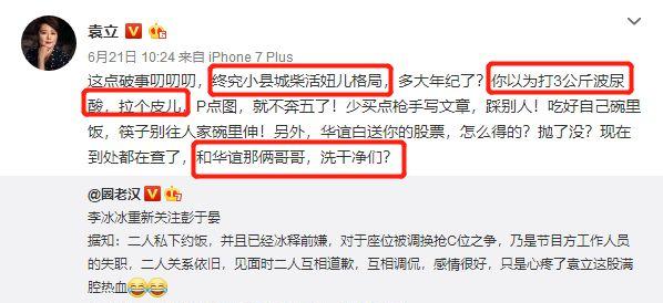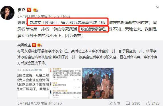 当年袁立可是在微博上阴阳怪气地刚过李冰冰,讽刺李冰冰是 " 县城文工团员 ",原因为两个人都曾是华谊元老,袁立觉得李冰冰抢了自己的资源。