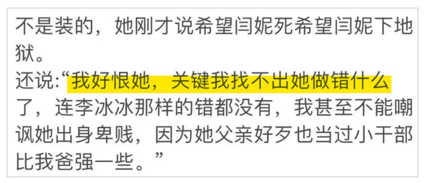 说完这些之后她还说:" 我好恨她,关键我找不出她做错什么了,连李冰冰那样的错都没有,我甚至不能嘲讽她出身卑贱,因为她父亲好歹也当过小干部比我爸强些。"